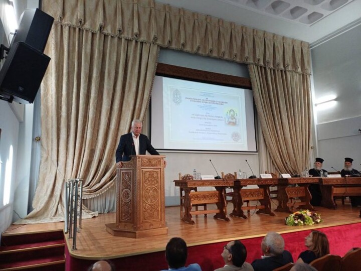 Η πρώτη Εισήγηση είχε ως θέμα: «Το δραματικό στοιχείο της θείας Λατρείας στο φως της παράδοσης και ζωής της Εκκλησίας». Ο Εισηγητής, Eλλογιμώτατος κ. Παναγιώτης Σκαλτσής, Ομότιμος Καθηγητής της Θεολογικής Σχολής του Πανεπιστημίου Θεσσαλονίκης, τόνισε μεταξύ άλλων τα εξής: «Η θεία Λατρεία ως η αέναη προσευχή και μυστική κοινωνία του ανθρώπου με τον Θεό εκφράζεται όχι μόνο με πνευματικά κριτήρια και πνευματικές προϋποθέσεις, αλλά και με τις διά των αισθήσεων ορατές λειτουργικές δραματουργίες. Η κίνηση, η λιτανευτική πομπή, η συμβολική απεικόνιση, ο διάλογος, η αναίμακτος θυσία, οι μυστηριακές πράξεις, ο ιερός χορός, ο χώρος και η δομή του ναού, τα εορτολογικά δρώμενα αποτελούν χαρακτηριστικό γνώρισμα της ‘’εν πνεύματι και αληθεία’’ Λατρείας της Εκκλησίας. Η όποια αξιοποίηση από τους Πατέρες όρων και μορφών από το αρχαίο δράμα (τελετή, θίασος, θέατρο, σκηνή, λιτανεία, ευταξία, χορός κ.ά.) ή προτυπώσεων από την Παλαιά Διαθήκη έχει εποπτικό χαρακτήρα και βοηθά στην μεταφορά και εμπέδωση των νέων νοημάτων και μηνυμάτων που εκφράζονται μέσα από την ιερουργία των μυστηρίων, των ακολουθιών και των εορτολογικών γεγονότων. Στις ακολουθίες, τις εορτές και τα ιερά μυστήρια, που ‘’σημαίνουν την Εκκλησία’’ και διά των οποίων το κτιστό κοινωνεί με το άκτιστο, διασώζονται εικόνες, παραστάσεις και λεξιλόγιο-δραματικοί όροι από τον χώρο των θεατρικών εκδηλώσεων, προκειμένου να προβληθεί η αλήθεια και το νέο που εκφράζουν το Ευαγγέλιο και η Λατρεία.».