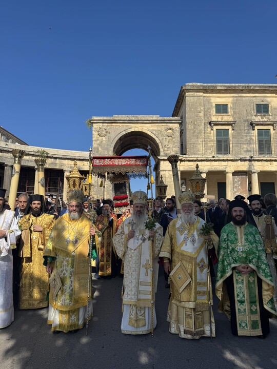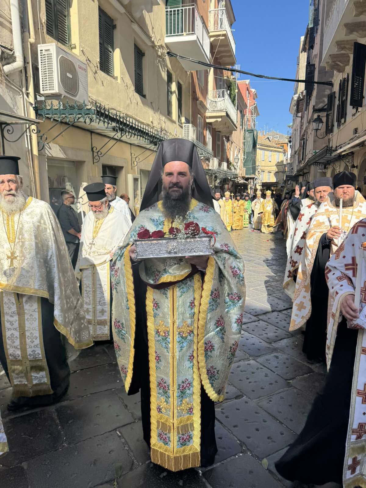 Στην είσοδο του Παλαιού Φρουρίου έγινε η καθιερωμένη γονυκλισία και ο Σεβασμιώτατος Μητροπολίτης Κερκύρας, Παξών και Διαποντίων Νήσων κ. Νεκτάριος διάβασε την προσευχή όλων στον Άγιο, ενώ στη συνέχεια, μπροστά από το ανάκτορο, έγινε η καθιερωμένη δέηση. Στη λιτανεία συμμετείχαν, προσκεκλημένοι του κ. Νεκταρίου, οι Σεβασμιώτατοι Μητροπολίτες Μπουκοβίνα και Μολδαβίας και Αρχιεπίσκοπος Ιασίου κ. Θεοφάνης, εκ της Εκκλησίας της Ρουμανίας, ο Σεβασμιώτατος Μητροπολίτης Ναζαρέτ κ. Κυριακός, εκ του Πατριαρχείου Ιεροσολύμων, ο οποίος έλκει την καταγωγή του από τα Χλωμοτιανά Κερκύρας, και ο Σεβασμιώτατος Μητροπολίτης Παραμυθίας, Φιλιατών, Πάργας και Γηρομερίου κ. Σεραπίων.