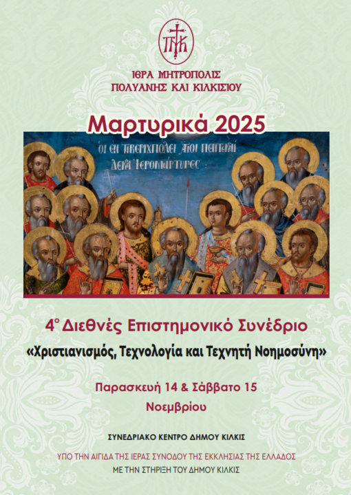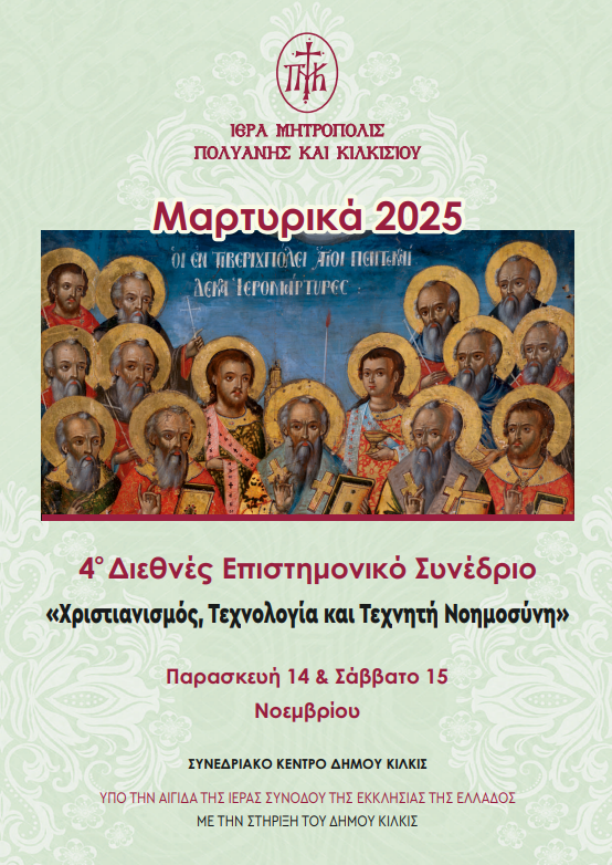 Κατόπιν πρωτοβουλίας του Σεβασμιωτάτου Μητροπολίτου Πολυανής και Κιλκισίου κ. Βαρθολομαίου, θα διοργανωθεί για τέταρτη χρονιά, την Παρασκευή 14 και το Σάββατο 15 Νοεμβρίου 2025, το θεσμοθετημένο διήμερο Διεθνές Επιστημονικό Συνέδριο με τίτλο «Μαρτυρικά 2025» και γενικό θέμα «Χριστιανισμός, Τεχνολογία και Τεχνητή Νοημοσύνη», εξ αφορμής των εκδηλώσεων που πραγματοποιούνται την περίοδο αυτή εν όψη του εορτασμού των Πολιούχων του Κιλκίς Αγίων Πεντεκαίδεκα Ιερομαρτύρων.