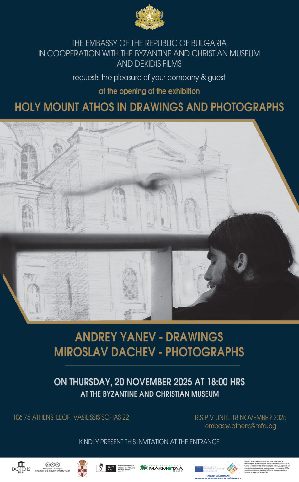 Η έκθεση «Το Άγιον Όρος μέσα από σκίτσα και φωτογραφίες», αποτέλεσμα της συνεργασίας του ζωγράφου Andrey Yanev και του καθηγητή Miroslav Dachev, πρύτανη της Εθνικής Ακαδημίας Θεάτρου και Κινηματογράφου της Βουλγαρίας, θα φιλοξενηθεί στο Βυζαντινό και Χριστιανικό Μουσείο από 20 Νοεμβρίου έως 4 Δεκεμβρίου 2025 (Λεωφ. Βασ. Σοφίας 22, Αθήνα). Η έκθεση θα λειτουργεί καθημερινά 08:30–15:30, εκτός Τρίτης, με ελεύθερη είσοδο.