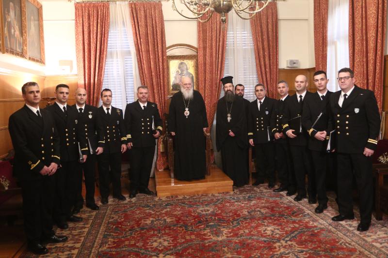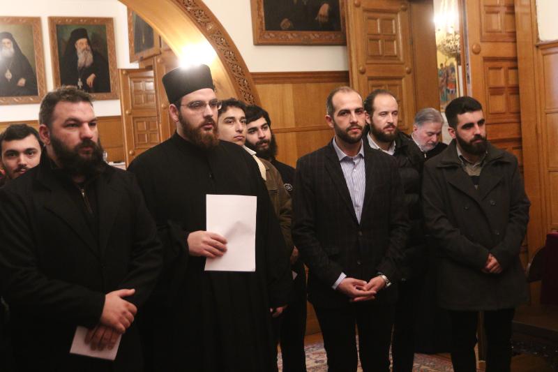 Αμέσως μετά, τα κάλαντα έψαλαν σπουδαστές από τη Σχολή Μαθητείας Υποψηφίων Κληρικών (Σ.Μ.Υ.Κ.). Τους σπουδαστές συνόδευαν ο Καθηγητής Μητροπολίτης Περιστερίου κ. Γρηγόριος, ο Επίσκοπος Ταλαντίου κ. Θεολόγος, Γενικός Διευθυντής του Ι.Π.Ε. της Ι.Α.Α., ο οποίος μετέφερε στον Αρχιεπίσκοπο ευχές εκ μέρους του ΕΣΕΕ, καθώς και ο Διευθυντής της ΣΜΥΚ – Ριζαρείου, Αρχιμανδρίτης Πολύκαρπος Κάστιζας, μαζί με καθηγητές της Σχολής.