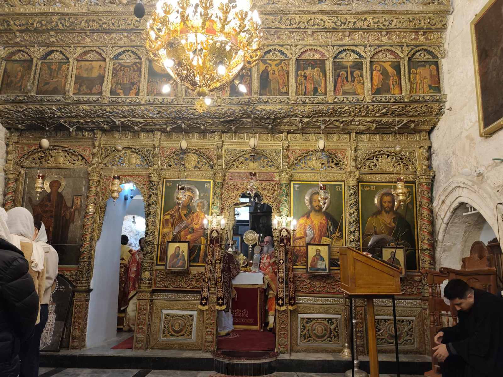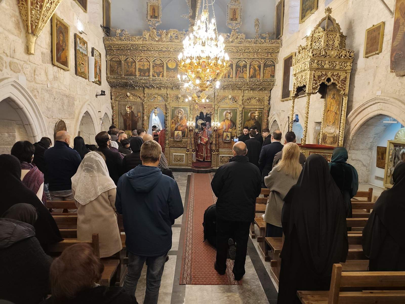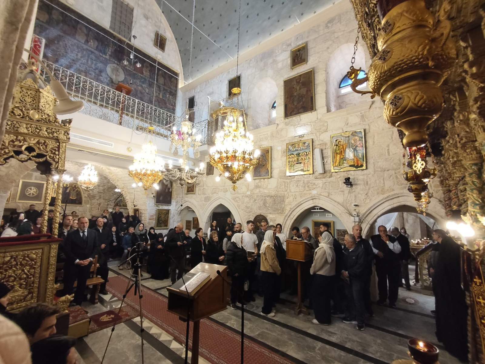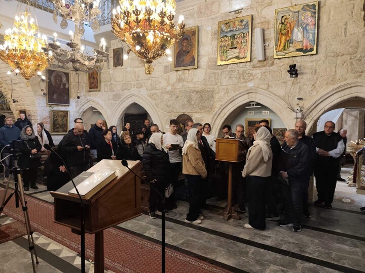 Στη Θεία Λειτουργία έψαλλαν οι βυζαντινοί χοροί σε δύο γλώσσες, ένας χορός (αριστερά) στα αραβικά και ένας στα ελληνικά (δεξιά). Με το πέρας της Θείας Λειτουργία θα ακολούθησε η Ακολουθία του Νιπτήρος, όπου ο Πατριάρχης έπλυνε τα πόδια 12 κληρικών, μιμούμενος τον Κύριό μας Ιησού Χριστό που έπλυνε τα πόδια των Αποστόλων λίγο πριν το Πάθος.