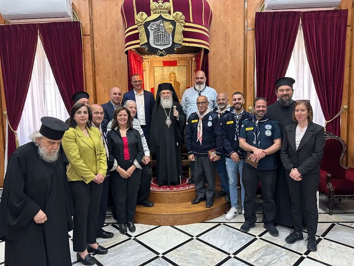 Το Σάββατον της εβδομάδος του Θωμά, 12/25 Απριλίου 2026, ο Μακαριώτατος Πατριάρχης Ιεροσολύμων κ.κ. Θεόφιλος εδέχθη ομάδα εκπροσώπων των Προσκόπων της Ιερουσαλήμ και μελών του Καθεδρικού Ναού του Αγίου Ιακώβου του Αδελφοθέου δι’ ευχαριστίας επί τη εορτή του Πάσχα και διά συζήτησιν επί των προκυψασών δυσκολιών εις τας τελετάς της Μεγάλης Εβδομάδος.