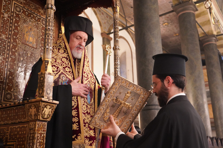 Στον Νάρθηκα του Πανσέπτου Πατριαρχικού Ναού ανέμενε και καλωσόρισε τον Μακαριώτατο ο Σεβ. Μητροπολίτης Γέρων Χαλκηδόνος κ. Εμμανουήλ, Πρόεδρος της Συνοδικής Επιτροπής επί των Διαχριστιανικών και Διαθρησκειακών Διαλόγων, ο οποίος χοροστάτησε στην Δοξολογία που τελέστηκε προς τιμήν του Προκαθημένου της Κοπτικής Εκκλησίας.