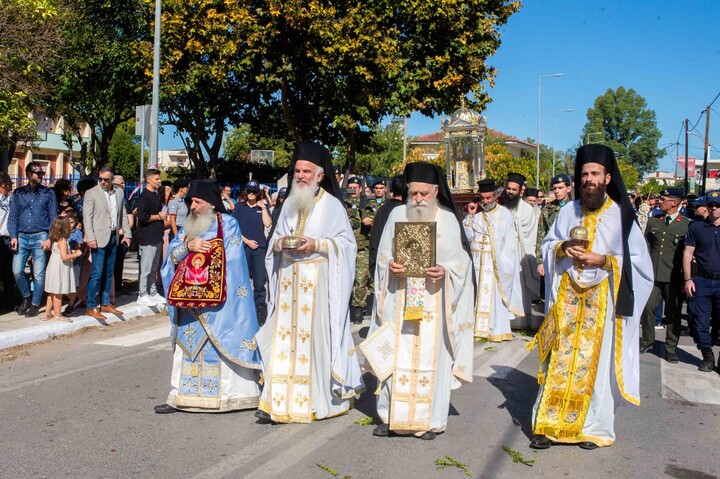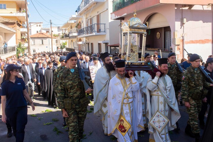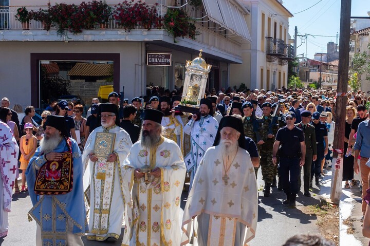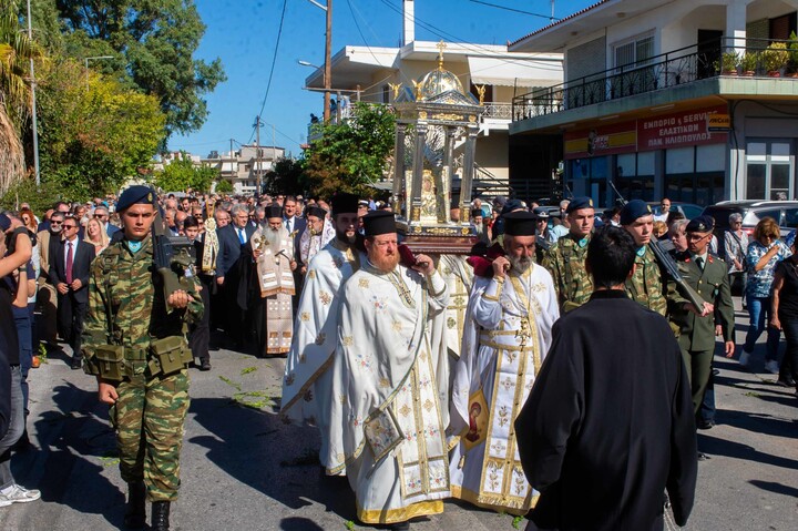 Η Ιερά Εικόνα με λιτανευτική πομπή περιήλθε τους κεντρικούς δρόμους της πόλης, οι οποίοι ήταν στρωμένοι με μυρτιές και άνθη καταλήγοντας στο Μετοχιακό Ιερό Ναό Ζωοδόχου Πηγής, όπου και εναποτέθηκε για οχταήμερο προσκύνημα.