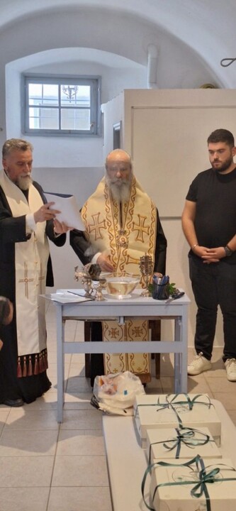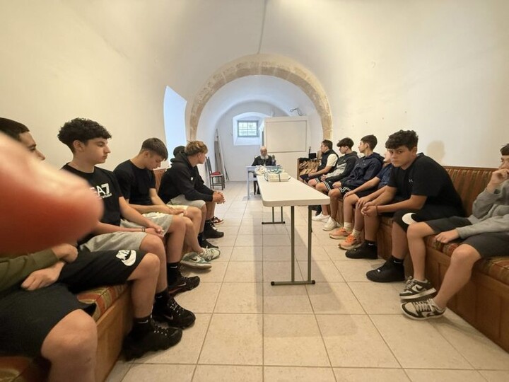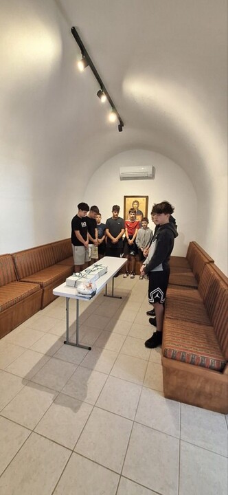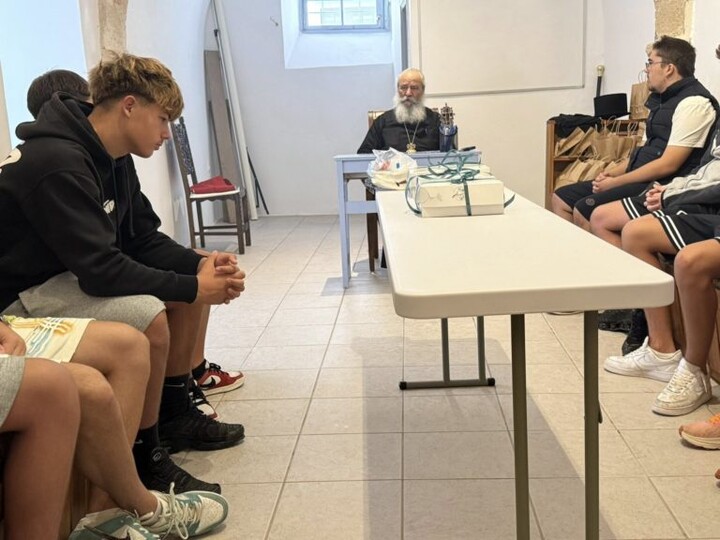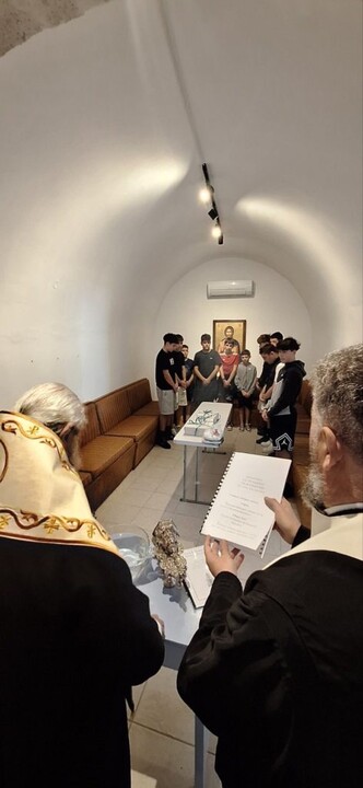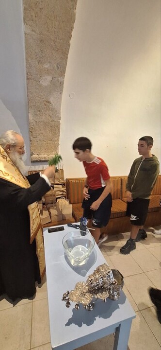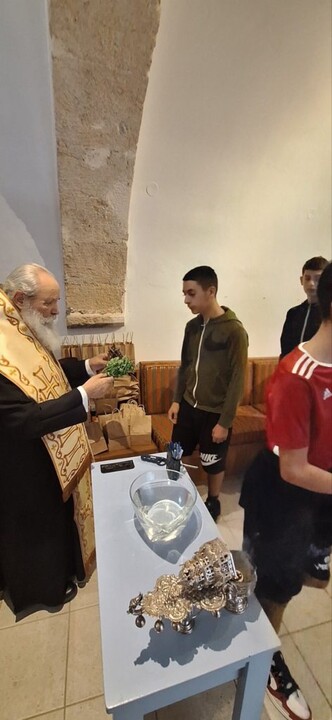 Μετά το κέρασμα στο Αρχονταρίκι ο Σεβασμιώτατος ετέλεσε στο κέντρο Νεότητος της Ιεράς Μητροπόλεως τον αγιασμό στην νεανική συντροφιά αγοριών Γυμνασίου και Λυκείου Ύδρας και ομίλησε κατάλληλα στα παιδιά ενώ τους προσέφερε ως ευλογία χρήσιμο δώρο.