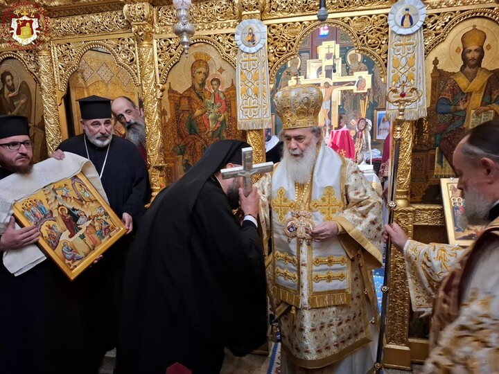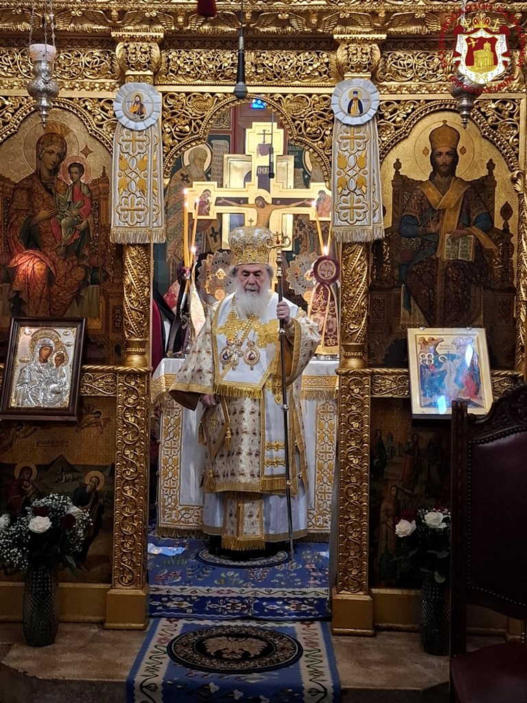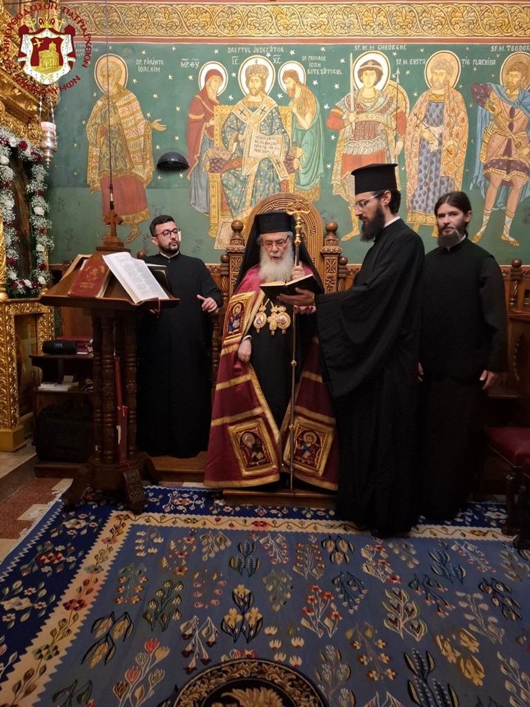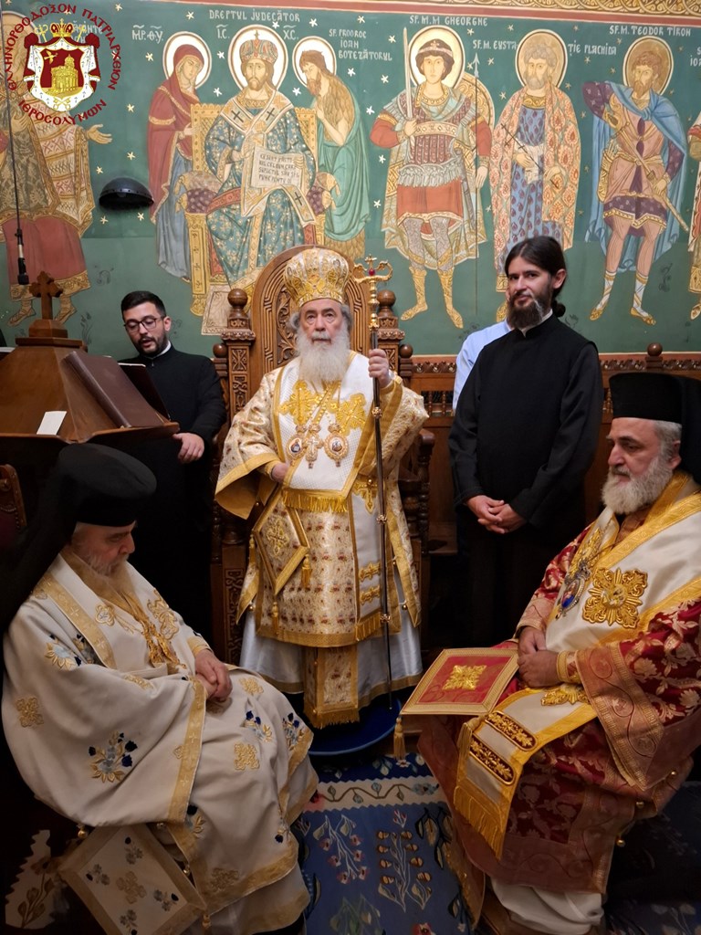 Μέ τήν εὐλογίαν τοῦ Μακαριωτάτου Πατριάρχου Δανιήλ, ἐτελέσαμεν σήμερον τήν Δοξολίγαν καί τήν θείαν Λειτουργίαν, προεξάρχοντος τοῦ Μακαριωτάτου Πατριάρχου Ἱεροσολύμων καί πάσης Παλαιστίνης. Χαιρόμεθα ἐκ βάθους ψυχῆς, ὅτι εὑρίσκεσθε σήμερον ἐν τῷ μέσῳ ἡμῶν καὶ ἐγὼ προσωπικῶς ἐκφράζω τήν βαθεῖαν εὐγνωμοσύνην μοῦ διὰ πᾶσαν τήν στήριξιν καὶ τάς πολυτίμους πνευματικάς διδασκαλίας, τάς ὁποίας ἐδέχθην ἐκ τῆς Μακαριότητός Σας.