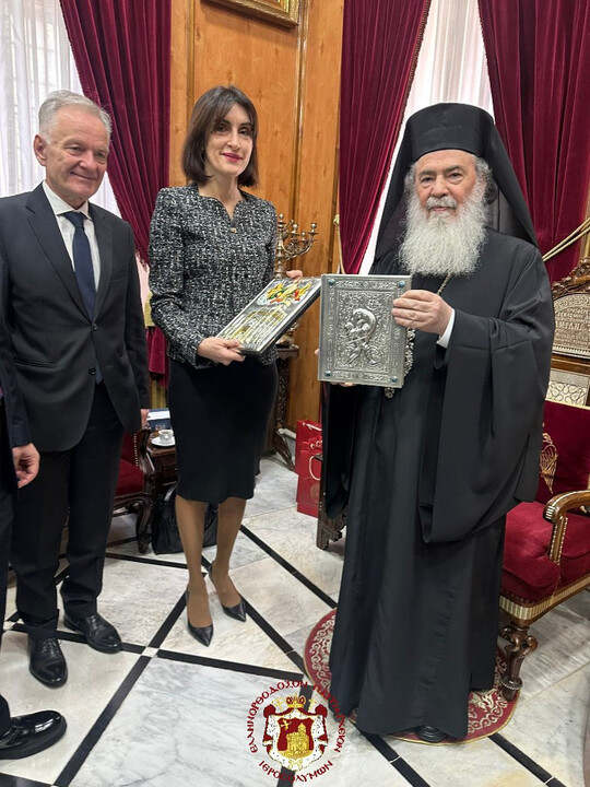 Ὁ Μακαριώτατος Πατριάρχης Ἱεροσολύμων κ.κ. Θεόφιλος Γ΄, ὑπεδέχθη σήμερον, εἰς τό Ἑλληνορθόδοξον Πατριαρχεῖον Ἱεροσολύμων, τὴν Ὑπουργὸν Ἐξωτερικῶν τῆς Γεωργίας, κ. Maca Botchorisvili, μετά τῶν συνοδευόντων αὐτήν ἀντιπροσώπων διπλωματῶν καί ἀξιωματούχων, ἐν πνεύματι Χριστιανικῆς κοινωνίας καὶ εὐγνωμοσύνης πρὸς τὸν Κύριον.