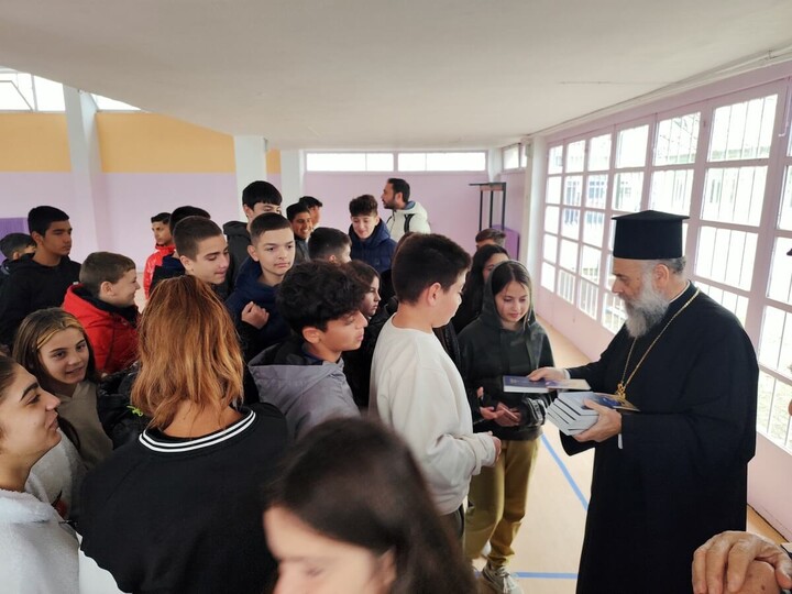 Με πατρική αγάπη και προσιτότητα, προσέφερε στους μαθητές της Α΄ Γυμνασίου την Καινή Διαθήκη, ως ένα πολύτιμο πνευματικό εφόδιο. Τα παιδιά ανταποκρίθηκαν με ιδιαίτερο ενδιαφέρον, συζητώντας μαζί του ζητήματα πίστης και αγιότητας, ενώ ο Μητροπολίτης τα ενθάρρυνε να καλλιεργούν τις χριστιανικές αξίες στην καθημερινότητά τους.