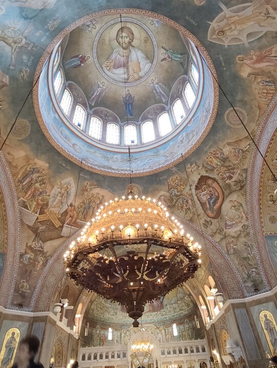 Η συνολική επιφάνεια του ναού ανέρχεται σε 1.900 m2 και του γυναικωνίτη σε 700 m2. Η χωρητικότητα του ναού υπολογίζεται σε 7.000 άτομα (καθαρή επιφάνεια ναού 1.500m2 * 4 άτομα ανά m2 και καθαρή επιφάνεια γυναικωνίτη 550 m2 * 3 άτομα ανά m2 ισοδυναμούν με 7.500 άτομα). Στην παραπάνω χωρητικότητα δεν υπολογίζονται οι επιφάνειες του κλιμακοστασίου, τοιχοδομών, ο χώρος του ιερού και φυσικά τα πρόπυλα. Το μήκος του ναού με τα πρόπυλα ανέρχεται σε 59,80 m και το πλάτος του σε 51,80 m. Ο κεντρικός τρούλλος έχει ύψος 40,5 m και η απόληξη του εξωτερικού σταυρού (του τρούλλου) ευρίσκεται στη στάθμη των 45 m. Ο τρούλλος αυτός περιστοιχίζεται από 12 άλλους χαμηλότερους τρούλλους-κωδωνοστάσια- που συμβολίζουν τον Ιησού Χριστό με τους 12 μαθητές του. Ο αρχικός σχεδιασμός προέβλεπε την επικάλυψη όλων των τρούλλων από φύλλα χαλκού ακόμη και των μικρών τρούλλων που βρίσκονται στην περιφέρεια, στα πρόπυλα. Η επιλογή του χαλκού ως υλικού επικάλυψης, επελέγη βάσει των χαρακτηριστικών του ιδιοτήτων ιδιαίτερα όμως για την ανθεκτικότητά του στην διάβρωση (παραθαλάσσιο περιβάλλον). […]