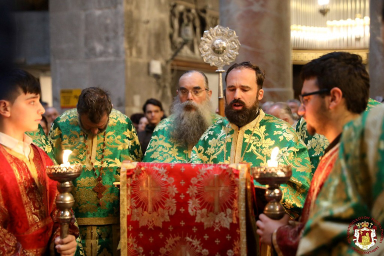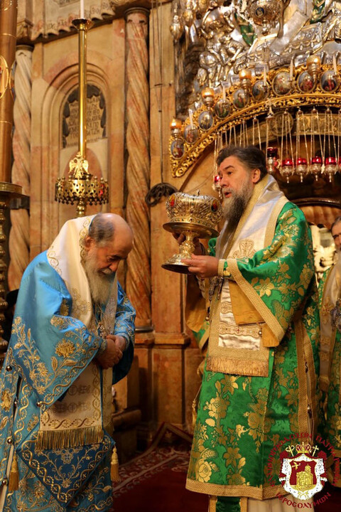 Ἅμα τῇ λήξει τοῦ ἁγιασμοῦ ἐτελέσθη πανηγυρικὴ καὶ κατανυκτικὴ θεία Λειτουργία τοῦ Μεγάλου Βασιλείου εἰς τὸν Πανάγιον καί Ζωοδόχον Τάφον ὑπὸ τοῦ Μακαριωτάτου, συλλειτουργούντων Αὐτῷ τῶν παρεπιδημούντων Μητροπολιτῶν Σεβασμιωτάτου Ξάνθης καί Περιθεωρίου κ. Παντελεήμονος καί Σερρῶν κ. Θεολόγου τῆς Ἐκκλησίας τῆς Ἑλλάδος, τῶν Ἁγιοταφιτῶν Ἀρχιερέων Σεβασμιωτάτου Μητροπολίτου Καπιτωλιάδος κ. Ἡσυχίου, τοῦ Γέροντος Ἀρχιγραμματέως Σεβασμιωτάτου Ἀρχιεπισκόπου Κωνσταντίνης κ. Ἀριστάρχου, τῶν Σεβασμιωτάτων Ἀρχιεπισκόπων Ἀνθηδῶνος κ. Νεκταρίου καί Πέλλης κ. Φιλουμένου, τοῦ Σεβασμιωτάτου Μητροπολίτου Τομίδος κ. Θεοδοσίου τῆς Ρουμανίας, πλείστων Ἁγιοταφιτῶν Ἱερομονάχων ἐκ τῶν διαμενόντων εἰς Ἱεροσόλυμα, ὧν πρῶτος ὁ Γέρων Καμαράσης Ἀρχιμανδρίτης π. Νεκτάριος, τῶν ἐκπροσώπων τοῦ Πατριαρχείου τῆς Μόσχας καὶ τοῦ Πατριαρχείου τῆς Ρουμανίας Ἀρχιμανδρίτου π. Ἰωάννου, πολλῶν Ἱερέων παρεπιδημούντων ἐξ Ἑλλάδος, Ρωσίας, Ρουμανίας καὶ Γεωργίας Σερβίας, παρουσίᾳ τοῦ Γενικοῦ Προξένου τῆς Ἑλλάδος εἰς τά Ἱεροσόλυμα κ. Δημητρίου Ἀγγελοσοπούλου καί τῆς κ. Ἄννης Μάντικα.