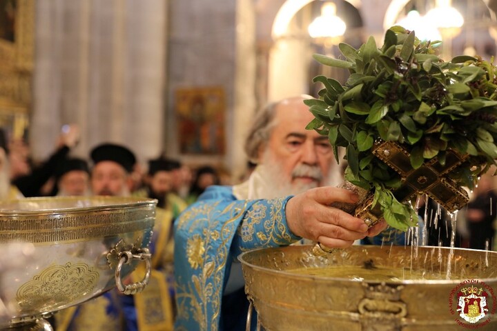 Διά τὴν ἑορτὴν αὐτὴν κατῆλθεν ἡ Ἁγιοταφιτική Ἀδελφότης διά τῶν βαθμίδων τοῦ Ναοῦ τοῦ Ἁγίου Ἰακώβου τοῦ Ἀδελφοθέου εἰς τὸ Καθολικὸν τοῦ Πανιέρου Ναοῦ τῆς Ἀναστάσεως ὑπὸ τὴν αἰγίδα τοῦ Μακαριωτάτου Πατρός ἡμῶν καί Πατριάρχου Ἱεροσολύμων κ.κ. Θεοφίλου, ὁ Ὁποῖος ἐτέλεσε τὸν Μέγαν Ἁγιασμὸν, ὡς ὁρίζει ἡ τάξις τῆς Ἐκκλησίας τῆς 6ης Ἰανουαρίου.