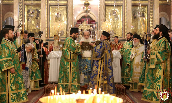 Ὁ Μακαριώτατος ἡγίασε τὸ ὕδωρ βυθίζων τὸν Σταυρὸν καί ψάλλων τρὶς τὸ «ἐν Ἰορδάνῃ βαπτιζομένου Σου, Κύριε» καὶ τὸ «ἐπεφάνης σήμερον τῇ οἰκουμένῃ καί τό φῶς Σου Κύριε ἐσημειώθη ἐφ’ ἡμᾶς» καὶ ἡγίασε τοὺς Ἀρχιερεῖς καὶ τοὺς Ἱερεῖς καὶ τὸν πιστὸν λαόν.