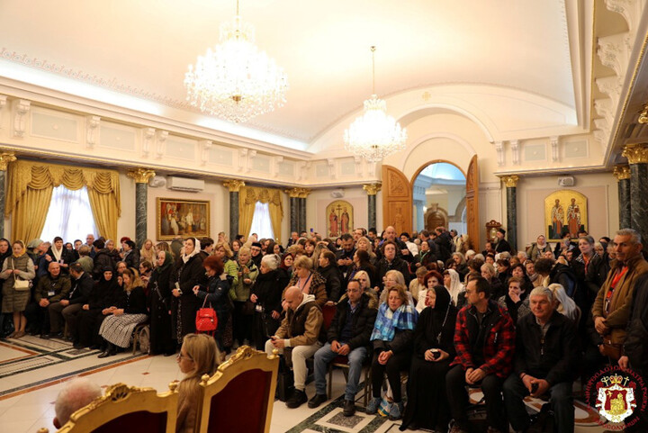 Ἅμα τῇ Ἀπολύσει τῆς θείας Λειτουργίας ἡγίασε διά τοῦ Τιμίου Σταυροῦ τοῦ περιέχοντος τὸ Τίμιον Ξύλον ὁ Μακαριώτατος τὸ ἐκκλησίασμα τῆς Ἐκκλησίας καὶ ἐράντισεν αὐτὸ διὰ τοῦ ὕδατος τοῦ Ἁγιασμοῦ.