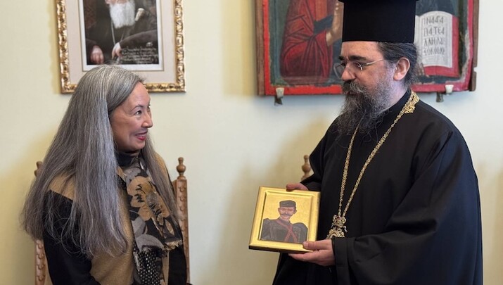 Ο Σεβασμιώτατος υποδέχθηκε εγκαρδίως την κ. Θίσσεν και την ξενάγησε στους χώρους του Ιερού Επισκοπείου, των διοικητικών γραφείων, καθώς και στο μνημείο του ιστορικού Μητροπολίτου Γερμανού Καραβαγγέλη.