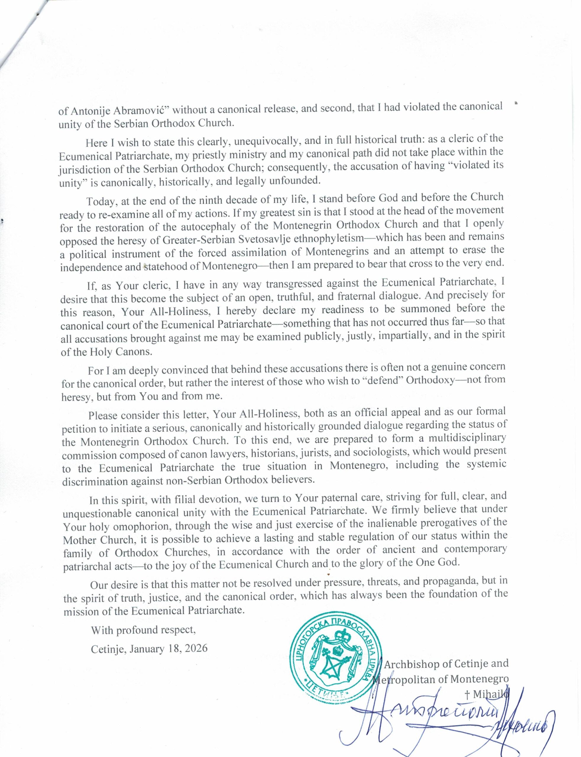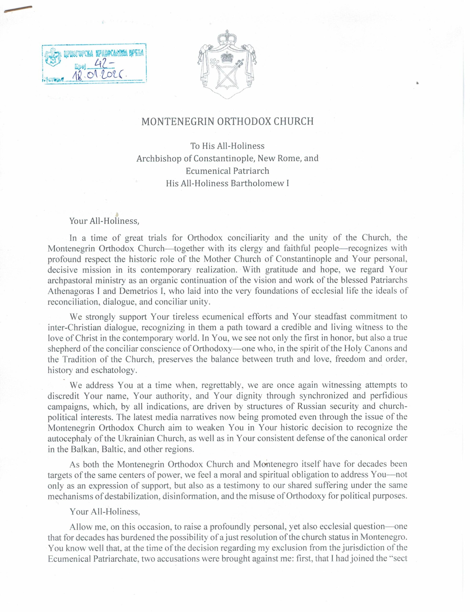 Ο κ. Μιχαήλ εκφράζει εξαρχής τον σεβασμό του προς τον Οικουμενικό Πατριάρχη, τον οποίο χαρακτηρίζει «αληθινό ποιμένα της συνοδικής συνείδησης της Ορθοδοξίας». Παράλληλα, δηλώνει τη στήριξη της αποκαλούμενης «Εκκλησίας του Μαυροβουνίου» σε ιστορικές αποφάσεις του Πατριαρχείου, όπως η αναγνώριση της Αυτοκεφαλίας της Ουκρανίας, καταγγέλλοντας ταυτόχρονα οργανωμένες προσπάθειες υπονόμευσης του Πατριάρχη από εκκλησιαστικο-πολιτικά συμφέροντα.