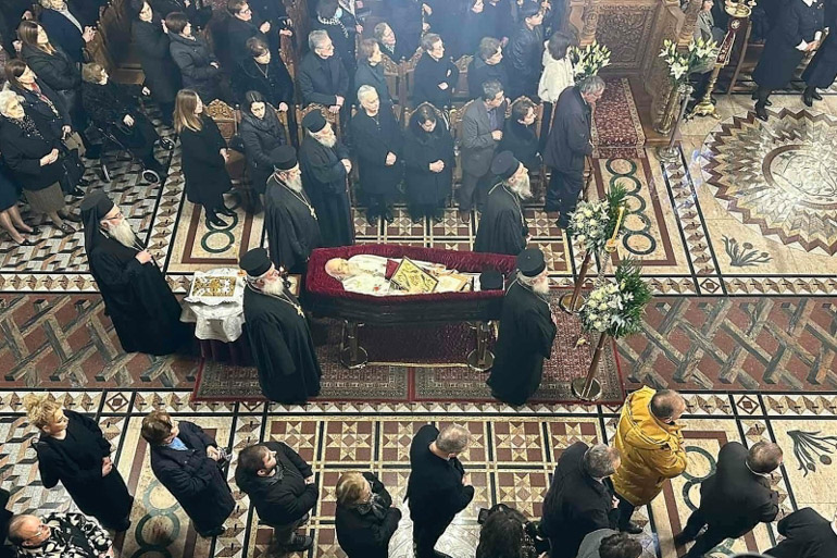 Της Νεκρώσιμης Ακολουθίας προέστη ο Σεβασμιώτατος Μητροπολίτης Βεροίας, Ναούσης και Καμπανίας κ. Παντελεήμων, ο οποίος εκφώνησε Επικήδειο Λόγο, ενώ συμμετείχαν και οι Σεβασμιώτατοι Μητροπολίτες Χαλκίδος, Ιστιαίας και Βορείων Σποράδων κ. Χρυσόστομος, Νεαπόλεως και Σταυρουπόλεως κ. Βαρνάβας, Γρεβενών κ. Δαβίδ, καθώς και ο Θεοφιλέστατος Επίσκοπος Δομενίκου κ. Αθηναγόρας.