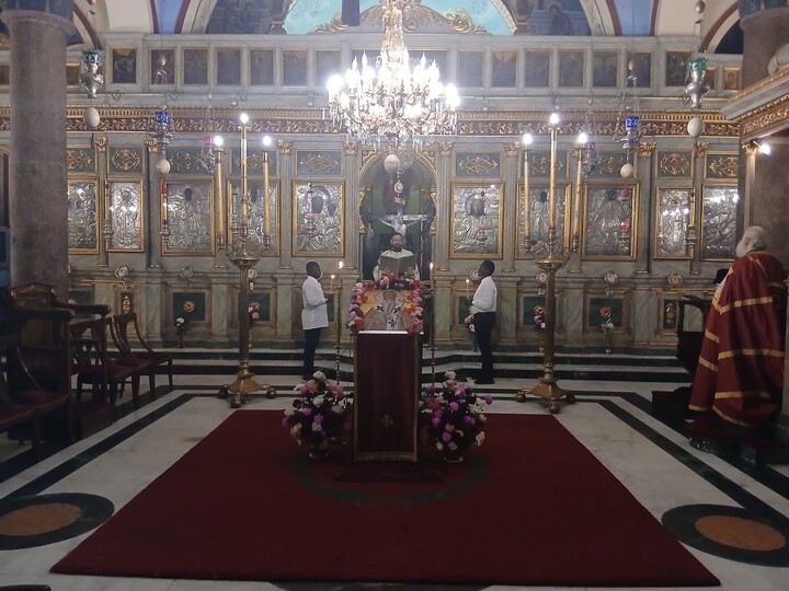 Της πανηγυρικής Θείας Λειτουργίας προεξήρχε ο Μακαριώτατος Πατριάρχης κ.κ. Θεόδωρος Β΄, πλαισιούμενος από τον Μητροπολίτη Ταμιάθεως κ. Γερμανό και τον Επίσκοπο Μαρεώτιδος κ. Δαμασκηνό. Παρέστησαν κληρικοί της Πατριαρχικής Αυλής, καθώς και οι μαθητές της Πατριαρχικής Σχολής «Άγιος Αθανάσιος», εκπροσωπώντας διάφορα έθνη της Αφρικανικής ηπείρου.