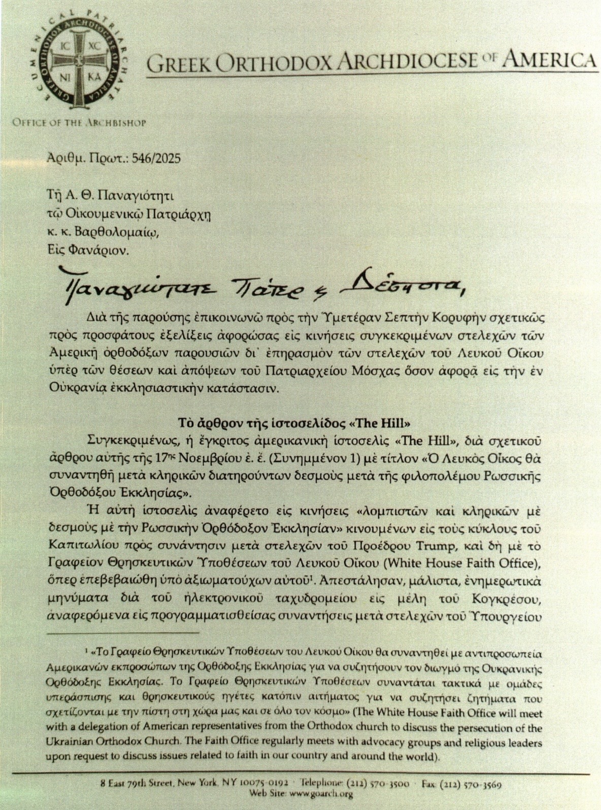 Το άρθρο του The Hill αναφέρει: «Η Ορθόδοξη Εκκλησία στην Αμερική, μέρος της αντιπροσωπείας, διατηρεί εκπροσώπηση στη Μόσχα». Αυτό δείχνει ότι ο Σεβασμιότατος πρόσθεσε σκόπιμα τη λέξη «λεγόμενη» όταν περιέγραφε την OCA - μια Εκκλησία με την οποία το Οικουμενικό Πατριαρχείο έχει κοινωνία αλλά δεν αναγνωρίζει ως αυτοκέφαλη.