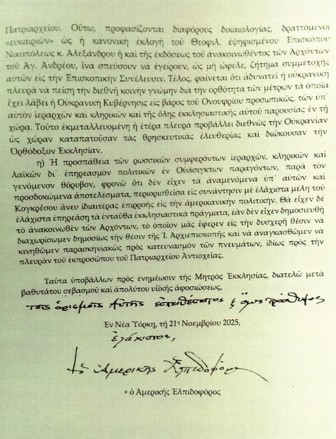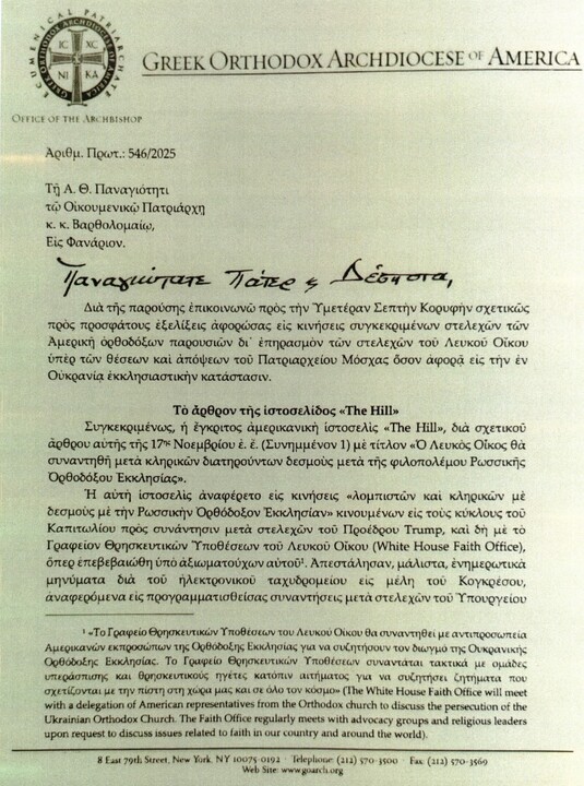 11 ΜΑΡΤΙΟΥ 2026 — Μια πολυσέλιδη επιστολή που έστειλε ο Αρχιεπίσκοπος Ελπιδοφόρος της Ελληνορθόδοξης Αρχιεπισκοπής Αμερικής στον Οικουμενικό Πατριάρχη Κωνσταντινουπόλεως Βαρθολομαίο στις 21 Νοεμβρίου 2025, διέρρευσε ανώνυμα στην Ένωση Ορθοδόξων Δημοσιογράφων Αμερικής.