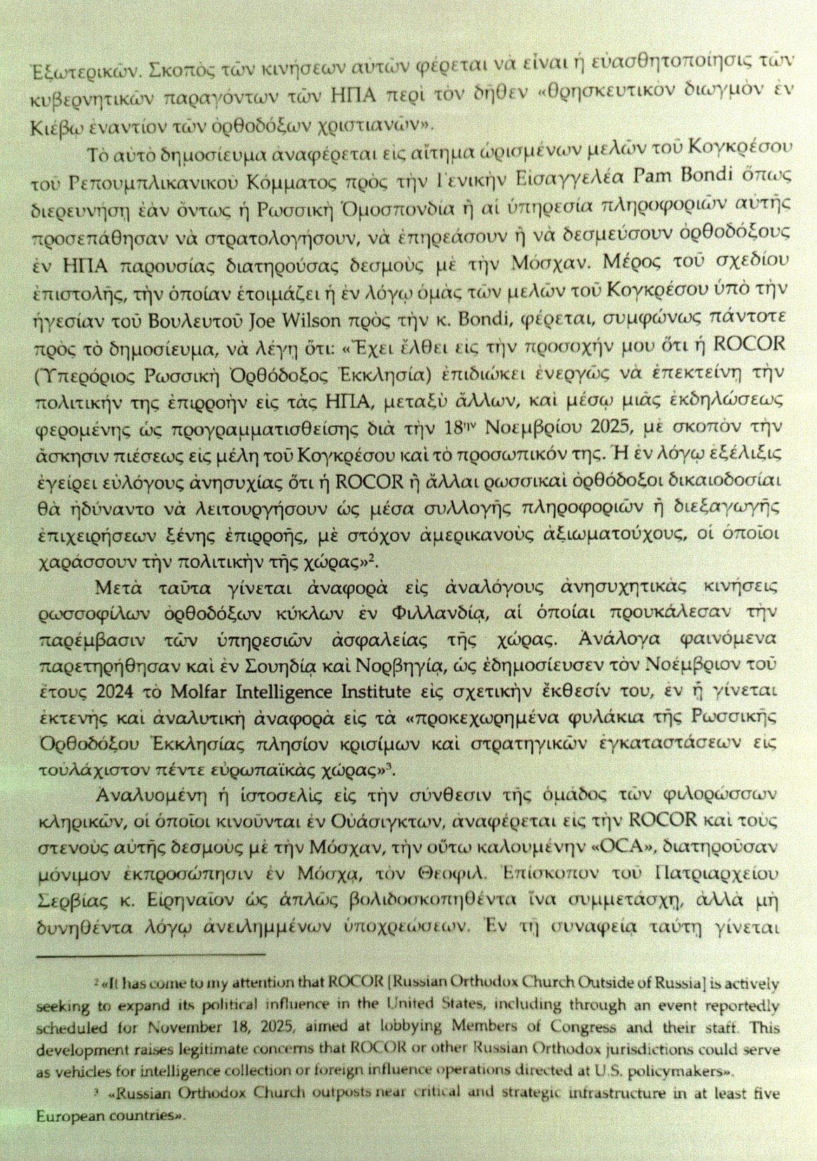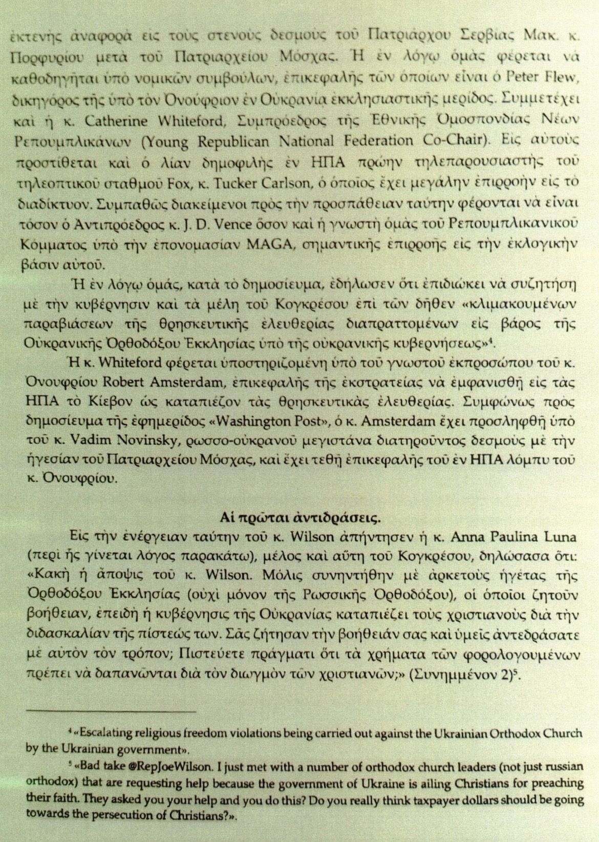 Γράφοντας για το The Hill, ο Αρχιεπίσκοπος Ελπιδοφόρος αναφέρει επίσης ότι «το άρθρο αναφέρεται στην ROCOR και τους στενούς δεσμούς της με τη Μόσχα, την λεγόμενη «OCA», η οποία διατηρεί μόνιμη εκπροσώπηση στη Μόσχα, και στον Επίσκοπο Ειρηναίο του Σερβικού Πατριαρχείου, ο οποίος φέρεται να προσεγγίστηκε για να συμμετάσχει, αλλά δεν μπόρεσε να το πράξει λόγω προηγούμενων υποχρεώσεων».