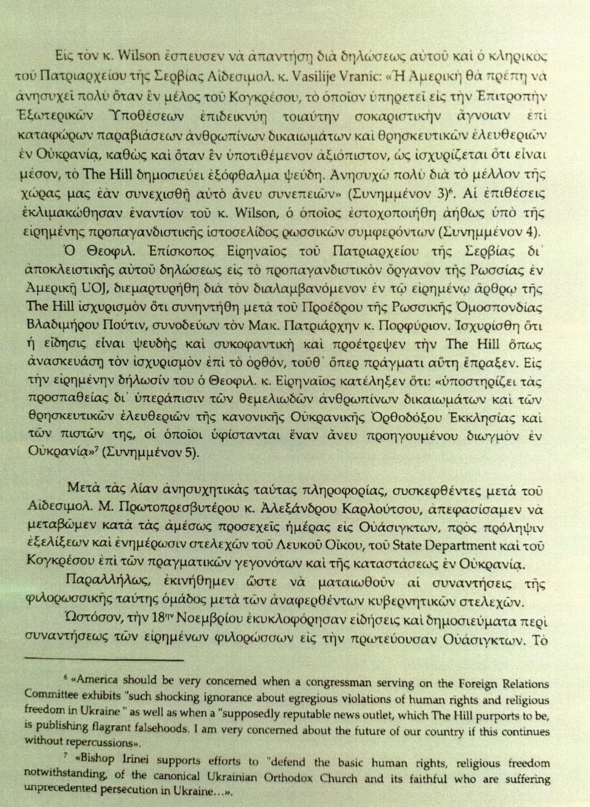 «Ο Επίσκοπος Ειρηναίος του Σερβικού Πατριαρχείου, σε αποκλειστική δήλωσή του στο ρωσικό προπαγανδιστικό μέσο ΕΟΔ στην Αμερική, διαμαρτυρήθηκε για τον ισχυρισμό της εφημερίδας The Hill ότι συναντήθηκε με τον Ρώσο Πρόεδρο Βλαντιμίρ Πούτιν ενώ συνόδευε τον Πατριάρχη Πορφύριο. Δήλωσε ότι το δημοσίευμα ήταν ψευδές και δυσφημιστικό και προέτρεψε την εφημερίδα The Hill να διορθώσει τον ισχυρισμό, κάτι που τελικά έγινε».