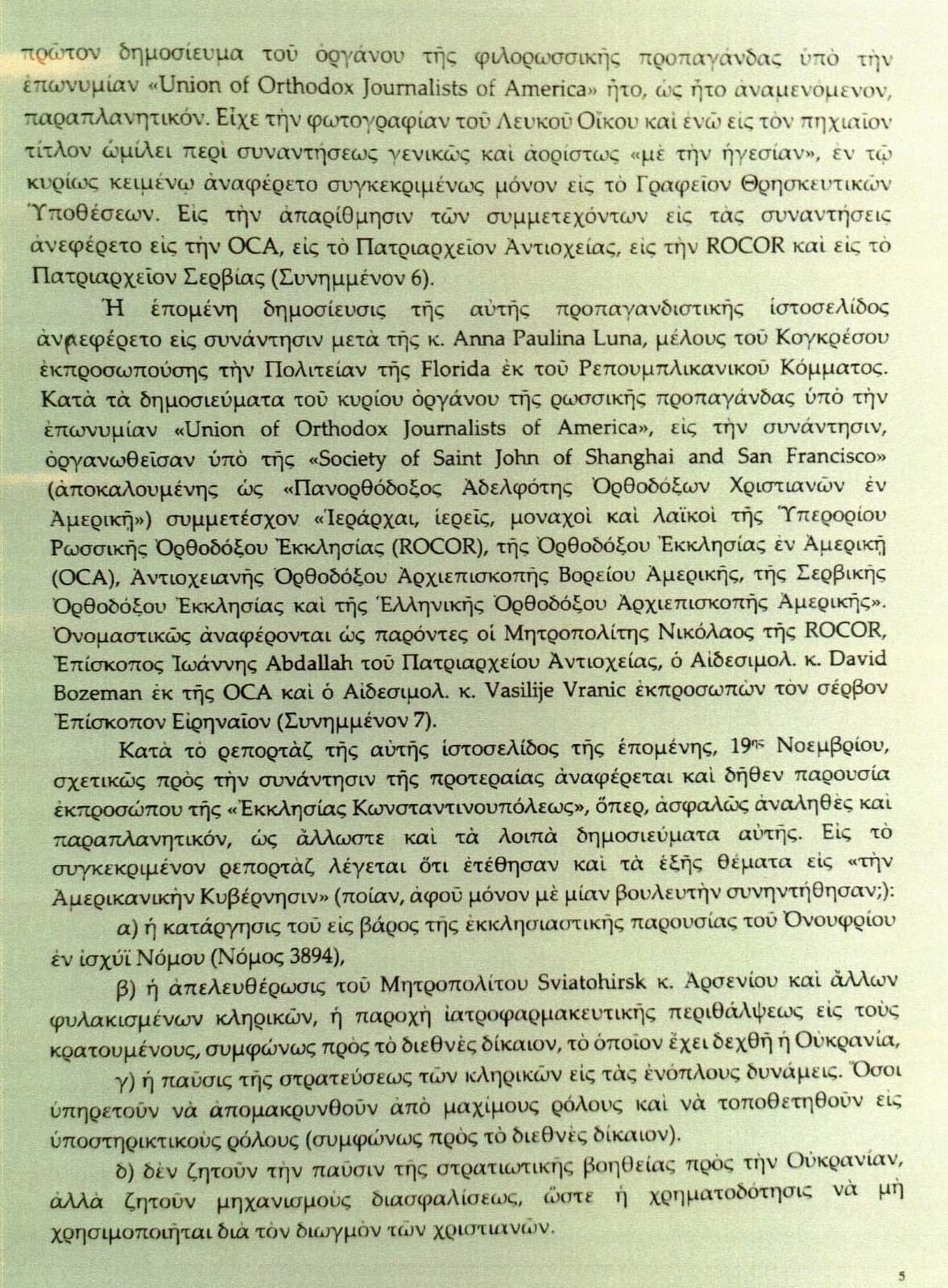 Ωστόσο, η αναφορά από την ΕΟΔ-USA σχετικά με τις συναντήσεις με την βουλευτή Άννα Παυλίνα Λούνα και τον βουλευτή Ντάρελ Ίσα ανέφερε μόνο ότι ήταν παρόντες «επίσκοποι, ιερείς, μοναχοί και λαϊκοί» διαφόρων δικαιοδοσιών, συμπεριλαμβανομένης της Ελληνορθόδοξης Αρχιεπισκοπής Αμερικής. Δεν υπάρχει χρήση της λέξης «εκπρόσωπος».