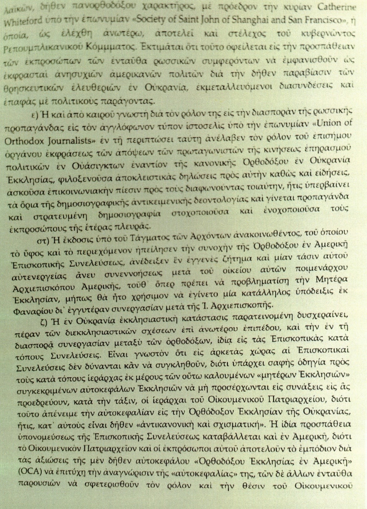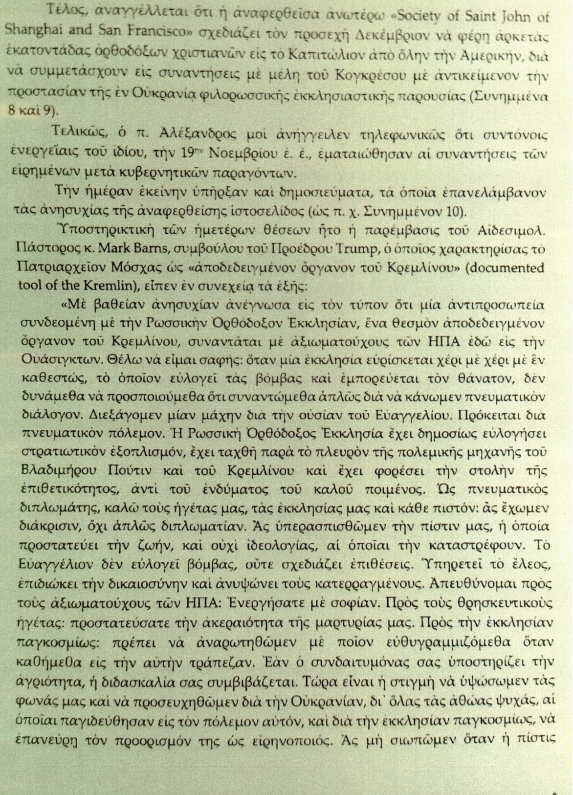 Στην επιστολή – που στάλθηκε μετά τις αρχικές συναντήσεις που πραγματοποιήθηκαν στο Καπιτώλιο από την Εταιρεία του Αγίου Ιωάννη της Σαγκάης και του Σαν Φρανσίσκο σχετικά με τον διωγμό της Ουκρανικής Ορθόδοξης Εκκλησίας (UOC) – ο Σεβασμιότατος προειδοποίησε τον Οικουμενικό Πατριάρχη ότι «η οργάνωση ανακοίνωσε επίσης σχέδια να φέρει αρκετές εκατοντάδες Ορθόδοξους Χριστιανούς στο Καπιτώλιο τον Δεκέμβριο για να συναντηθούν με μέλη του Κογκρέσου σχετικά με την προστασία της φιλορωσικής εκκλησιαστικής παρουσίας στην Ουκρανία».
