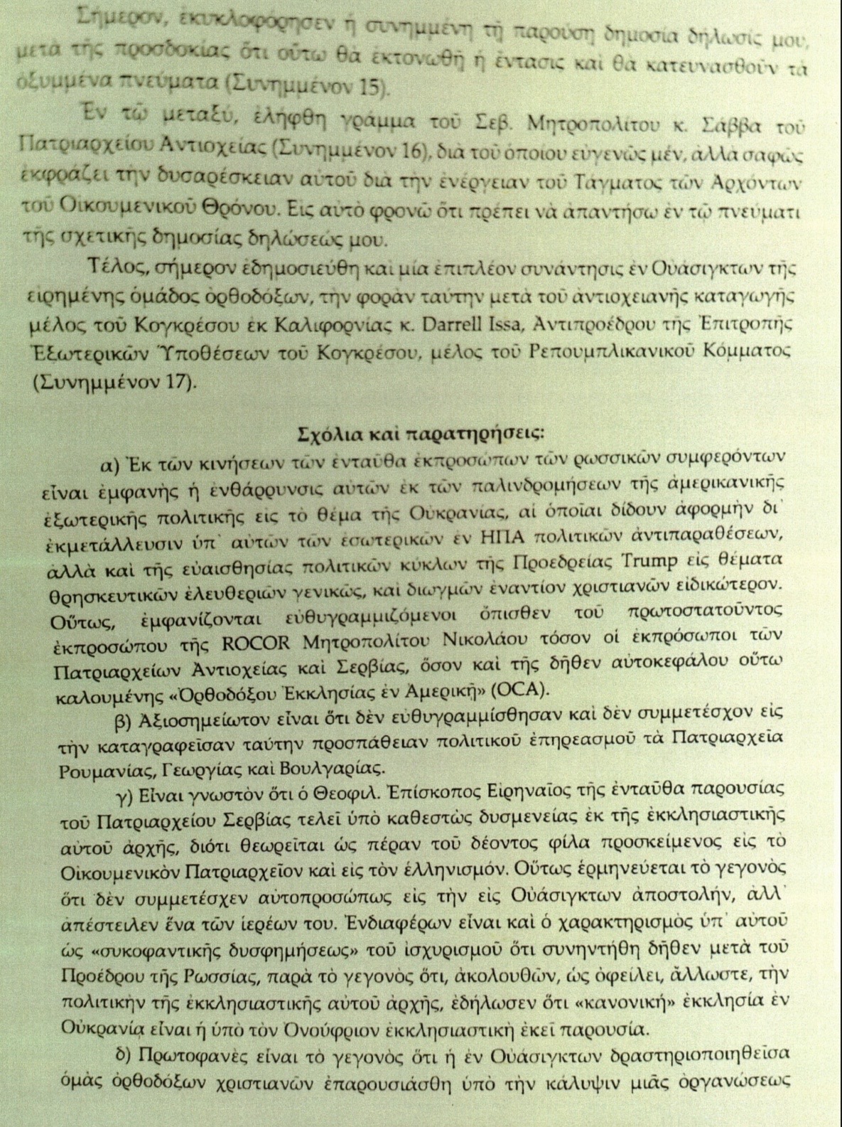 Σε άλλο σημείο της επιστολής, ο Σεβασμιότατος αναφέρει ότι ο Επίσκοπος Ειρηναίος φέρεται να αντιμετωπίζεται δυσμενώς από τις εκκλησιαστικές αρχές επειδή θεωρείται υπερβολικά συμπαθής προς το Οικουμενικό Πατριαρχείο και τον Ελληνισμό.