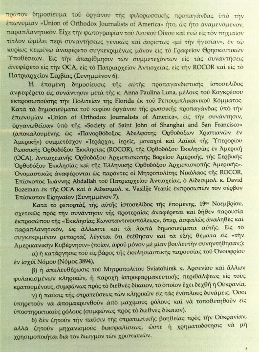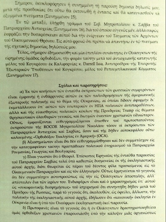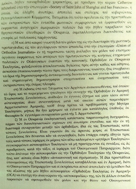 Είπε επίσης ότι η παρατεταμένη εκκλησιαστική κρίση στην Ουκρανία συνεχίζει να περιπλέκει την ορθόδοξη συνεργασία στη διασπορά και ότι το ουκρανικό λόμπι «φαίνεται ανίκανο να πείσει τη διεθνή κοινή γνώμη για την ορθότητα των μέτρων που ελήφθησαν κατά του Ονούφριου και της εκκλησιαστικής του δομής, τα οποία η αντίπαλη πλευρά εκμεταλλεύεται για να παρουσιάσει την Ουκρανία ως παραβιάζουσα τη θρησκευτική ελευθερία».