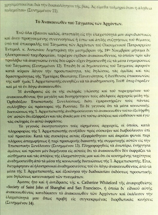 Ενώ τα πράγματα προχωρούσαν ομαλά, ένα σχέδιο δήλωσης στάλθηκε στον ταπεινό μου εαυτό απροσδόκητα και χωρίς προηγούμενη διαβούλευση ή έστω απλή συζήτηση του θέματος από τον επικεφαλής του Τάγματος των Αρχόντων του Οικουμενικού Πατριαρχείου, Αξιότιμο κ. Αντώνιο Λυμπεράκη, το μεσημέρι της 19ης Νοεμβρίου, μέσω ηλεκτρονικού ταχυδρομείου.