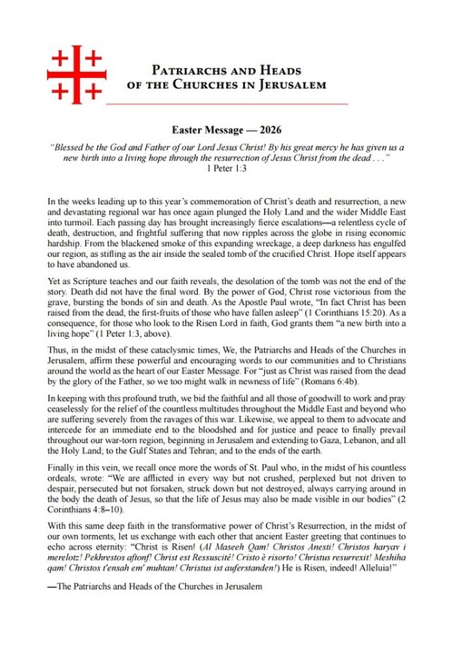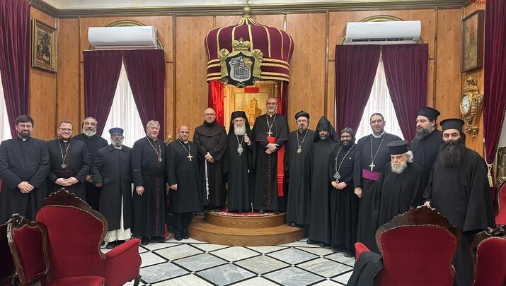 Συνάντηση Αρχηγών Εκκλησιών στα Ιεροσόλυμα υπό τον Πατριάρχη Ιεροσολύμων Θεόφιλο Γ΄ με επίκεντρο το Πασχάλιο μήνυμα και τις συνθήκες πολέμου.