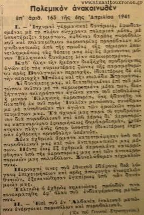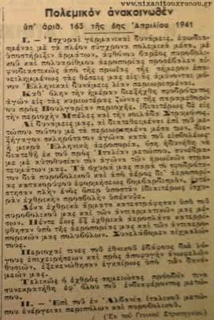 Ο ηρωικός αγώνας του ελληνικού στρατού σε δύο μέτωπα, απέναντι στις σιδερόφραχτες στρατιές της φασιστικής Ιταλίας και της ναζιστικής Γερμανίας προκάλεσε το θαυμασμό σ’ όλο τον κόσμο. Επί 16 μέρες αντιμετώπισε τη φονικότερη στρατιωτική μηχανή που γνώρισε ποτέ η ανθρωπότητα.