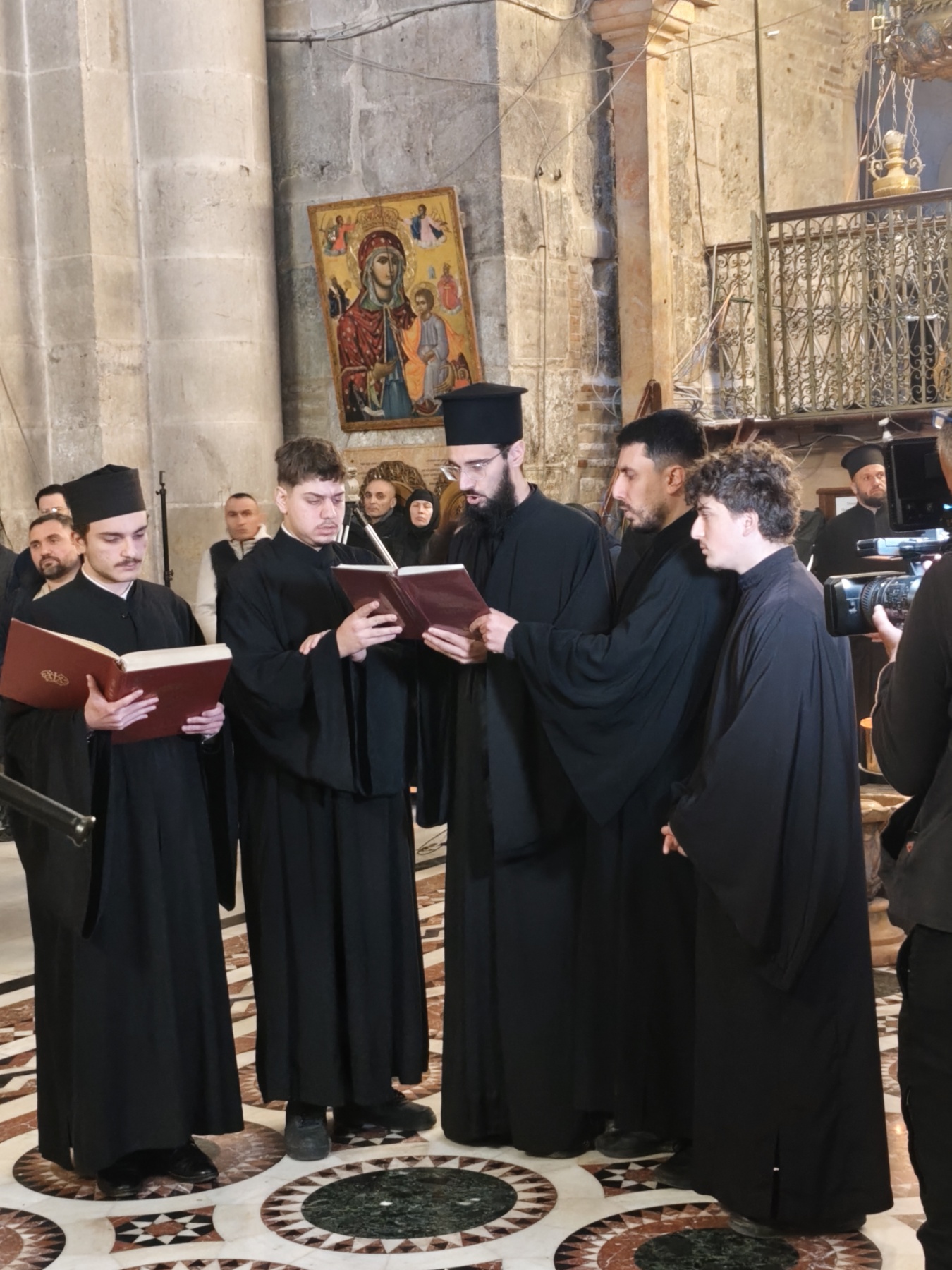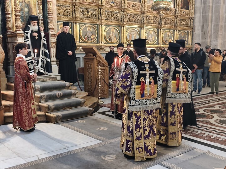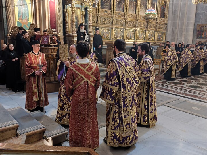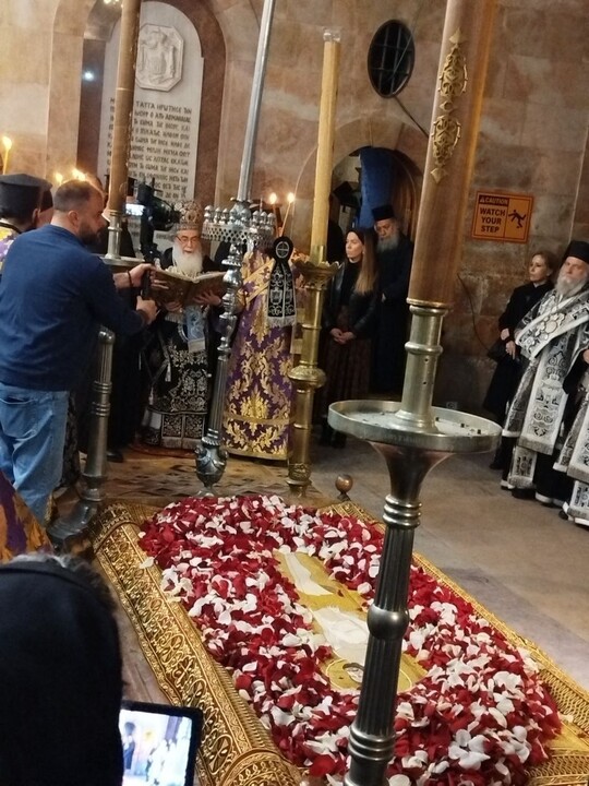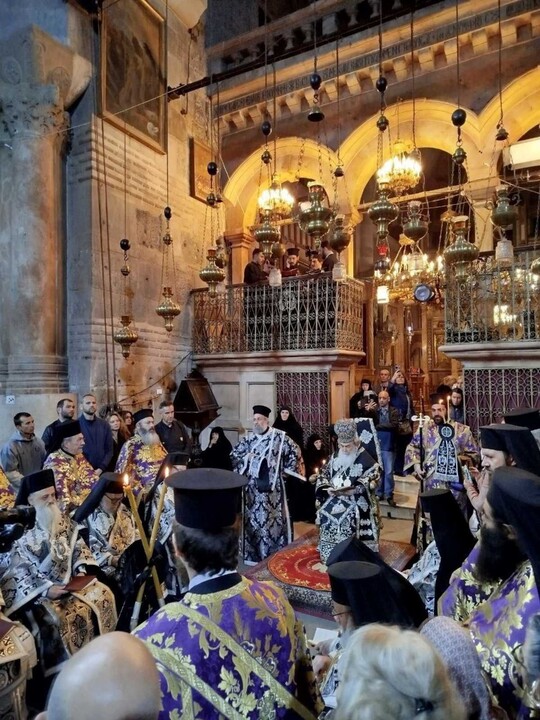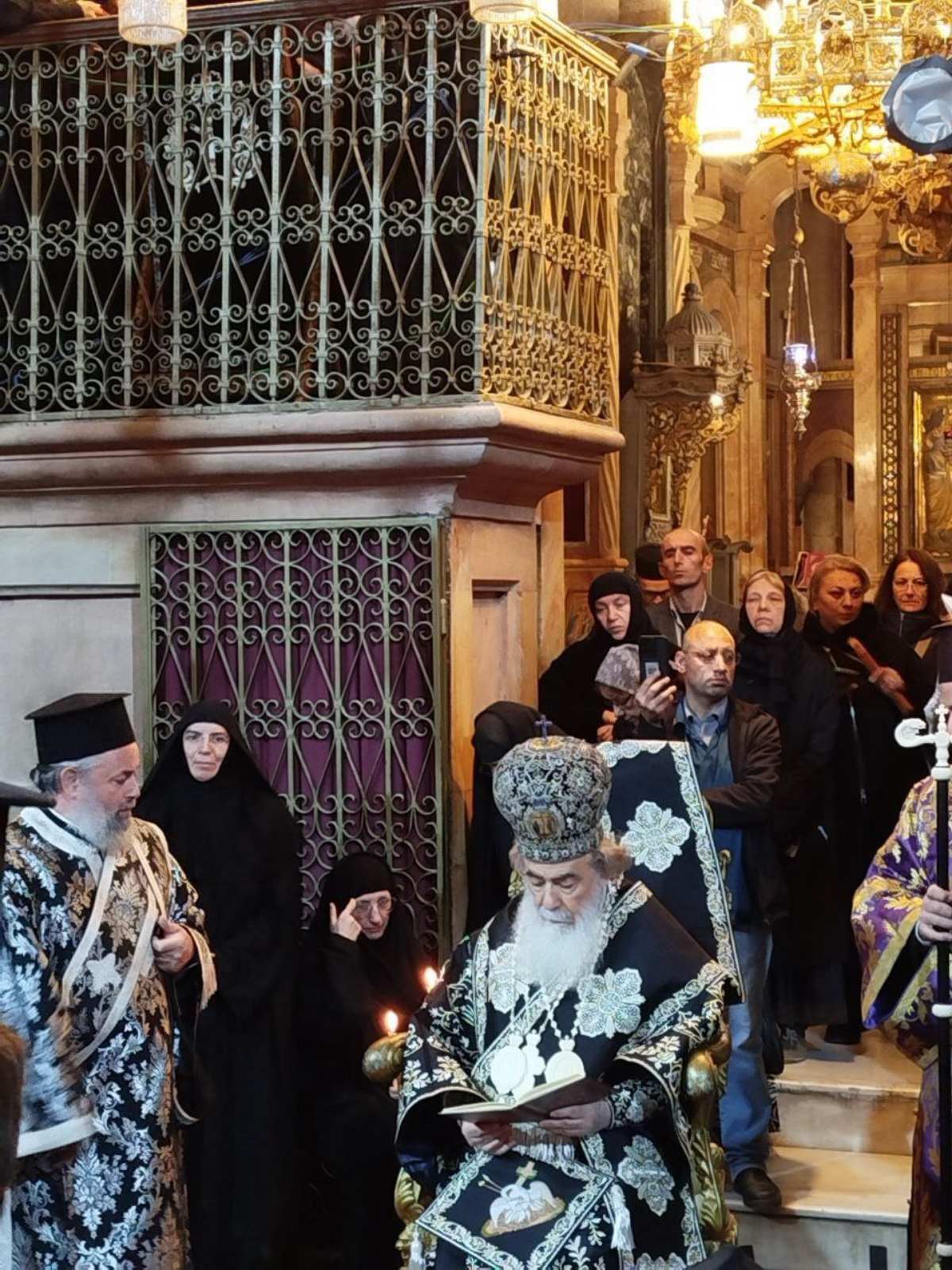 Το μεσημέρι της Μ. Παρασκευής τελέστηκε στο Ναό της Αναστάσεως ο Εσπερινός της Αποκαθηλώσεως χοροστατούντος του Μακαριωτάτου Πατριάρχου Ιεροσολύμων Θεοφίλου και με τη συμμετοχή πολλών ιερέων και διακόνων.