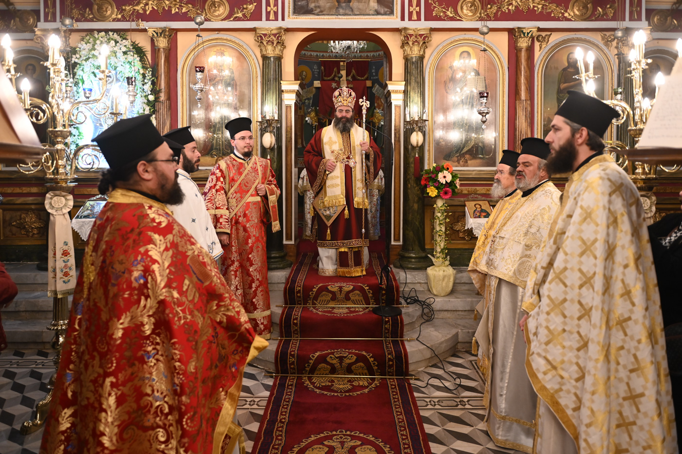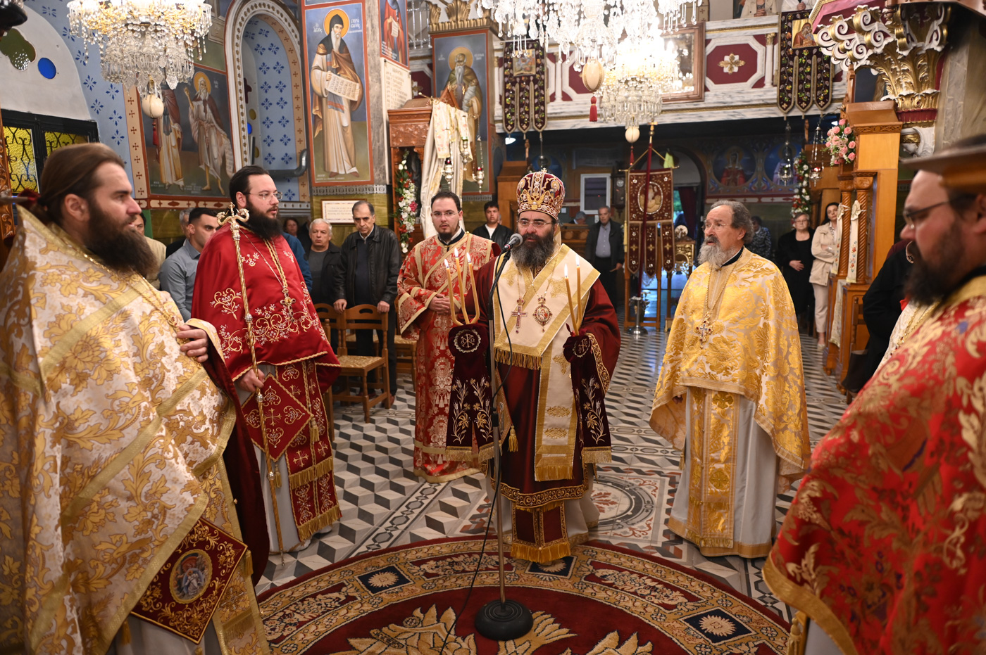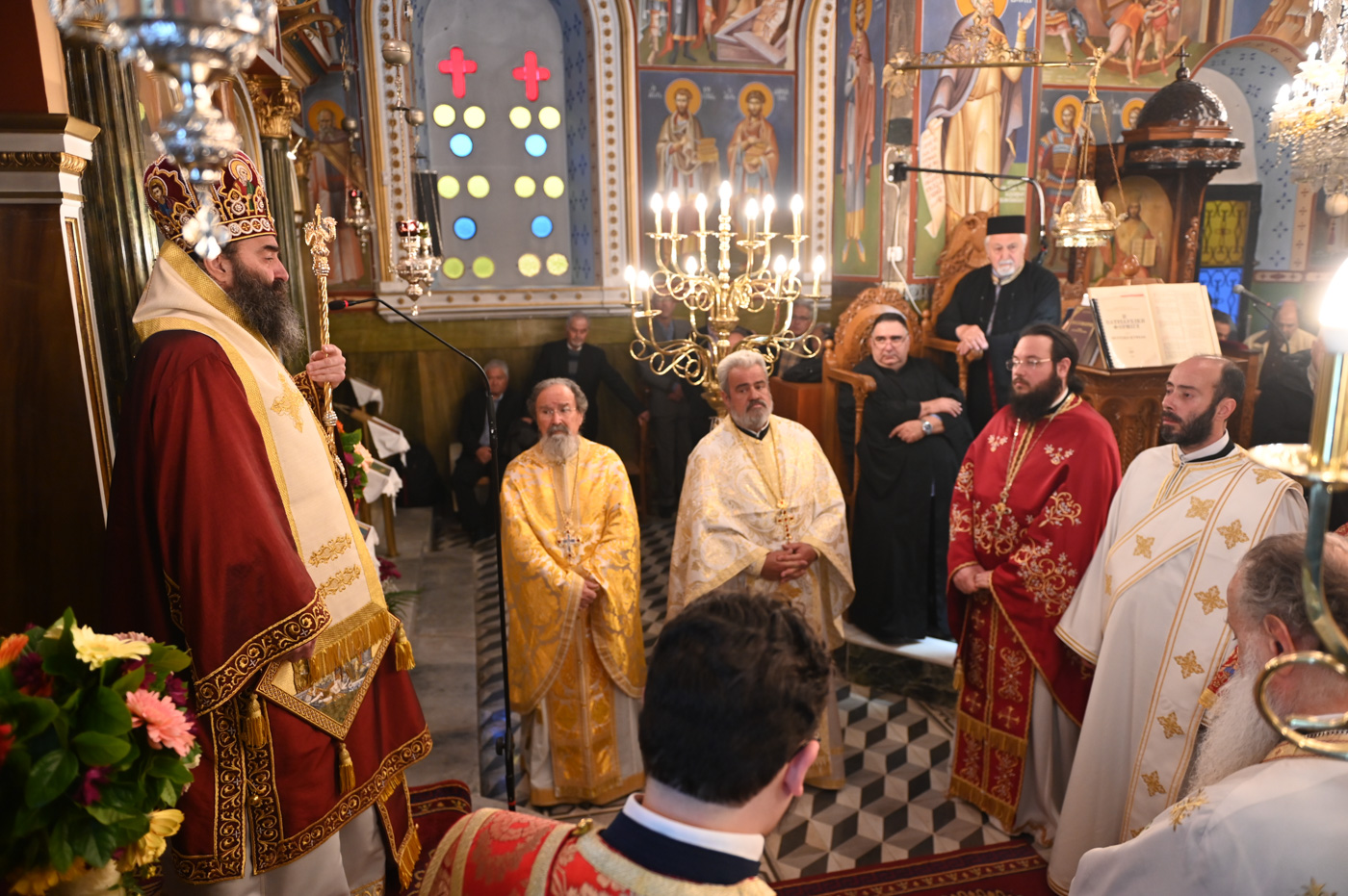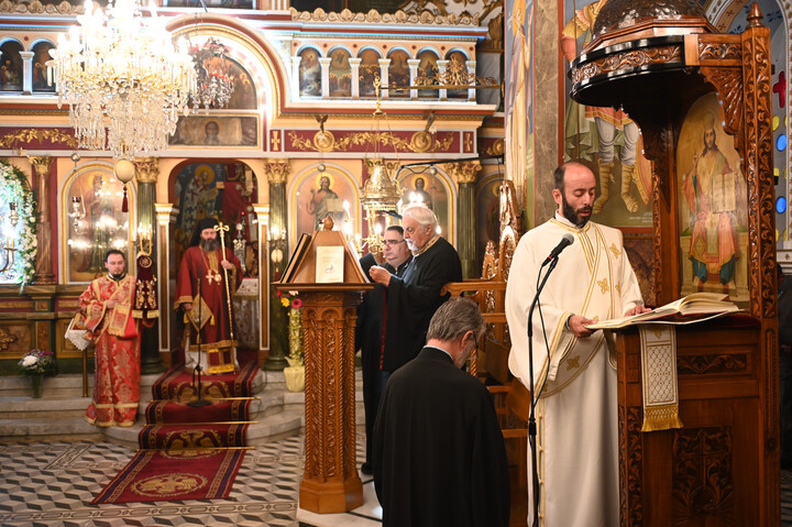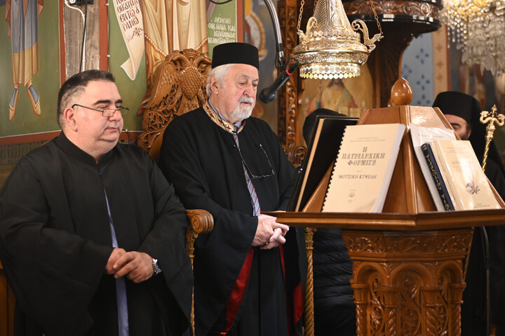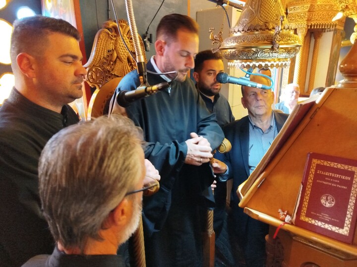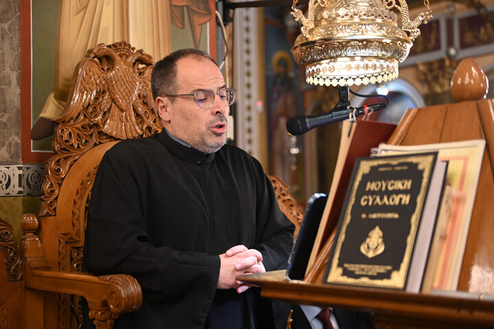 Το Αναλόγιο εκόσμησαν κατά τον Εσπερινό και την Θεία Λειτουργία ο Άρχων Υμνωδός ΜτΧΕ κ. Γεώργιος Χατζηχρόνογλου και ο κ. Κωνσταντίνος Λειβαδάρος, όπως και οι Ιεροψάλτες του Ιερού Ναού.