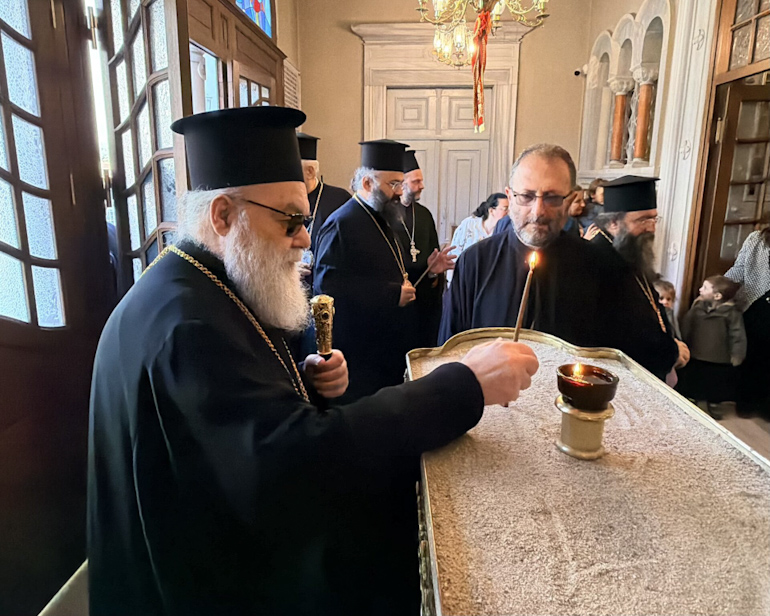 Εκεί τους υπεδέχθη ο Ποιμενάρχης, Σεβ. Μητροπολίτης Γέρων Χαλκηδόνος Εμμανουήλ, πλαισιούμενος από τον Πρωτοσύγκελλό του Πανοσιολ. Αρχιμανδρίτη Ευγένιο Καρατζά και άλλους συνεργάτες του, ενώ μικρά παιδιά της Κοινότητος προσέφεραν ανοιξιάτικα άνθη στον Προκαθήμενο του Πρεσβυγενούς Πατριαρχείου Αντιοχείας.