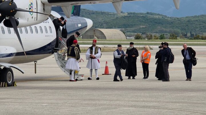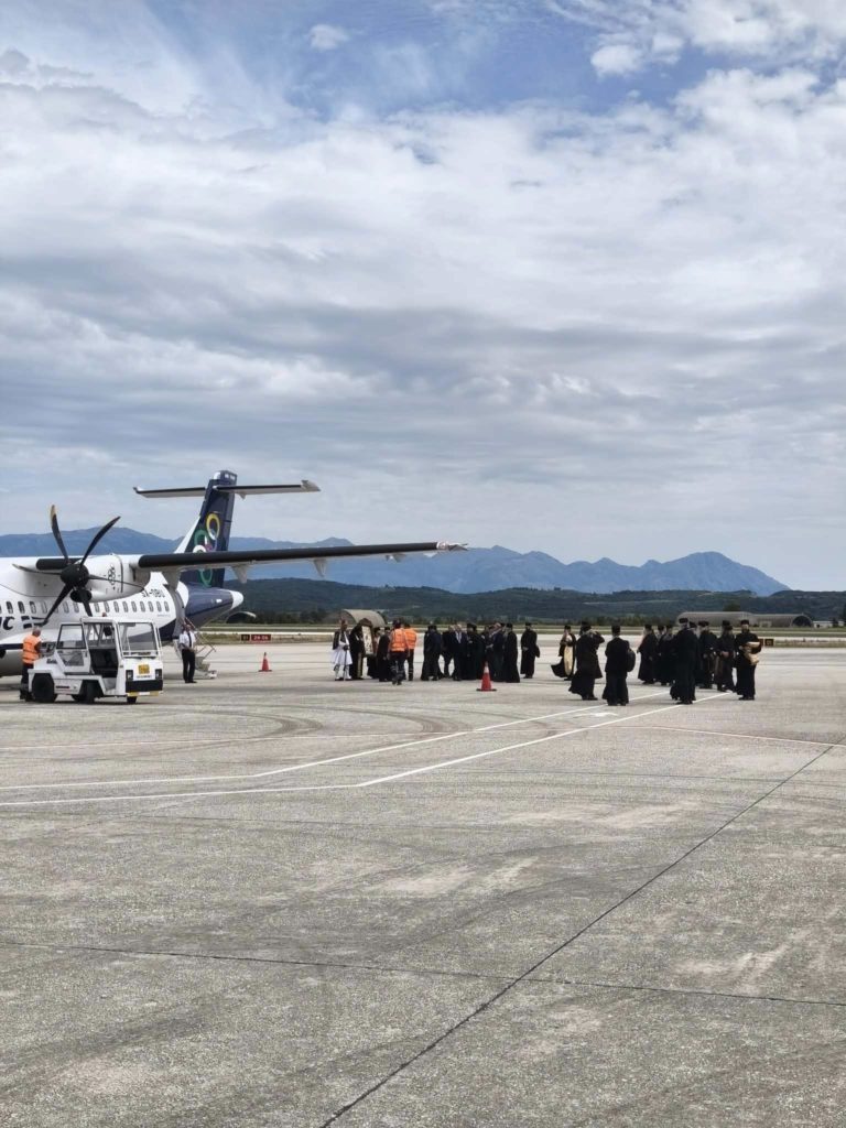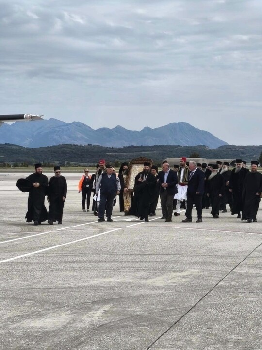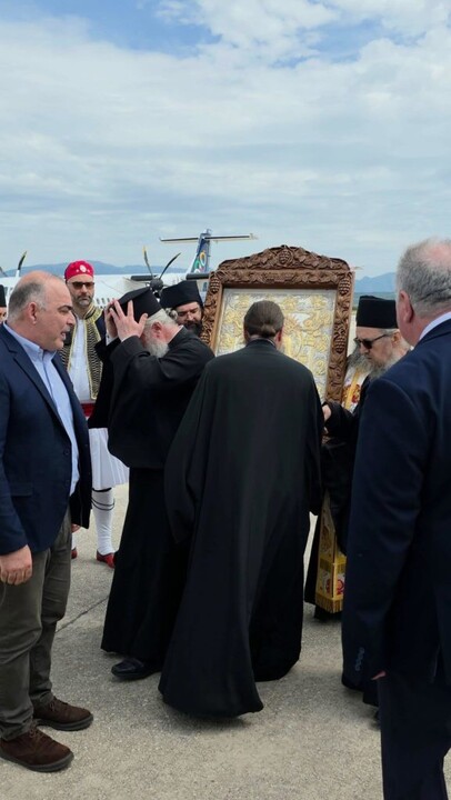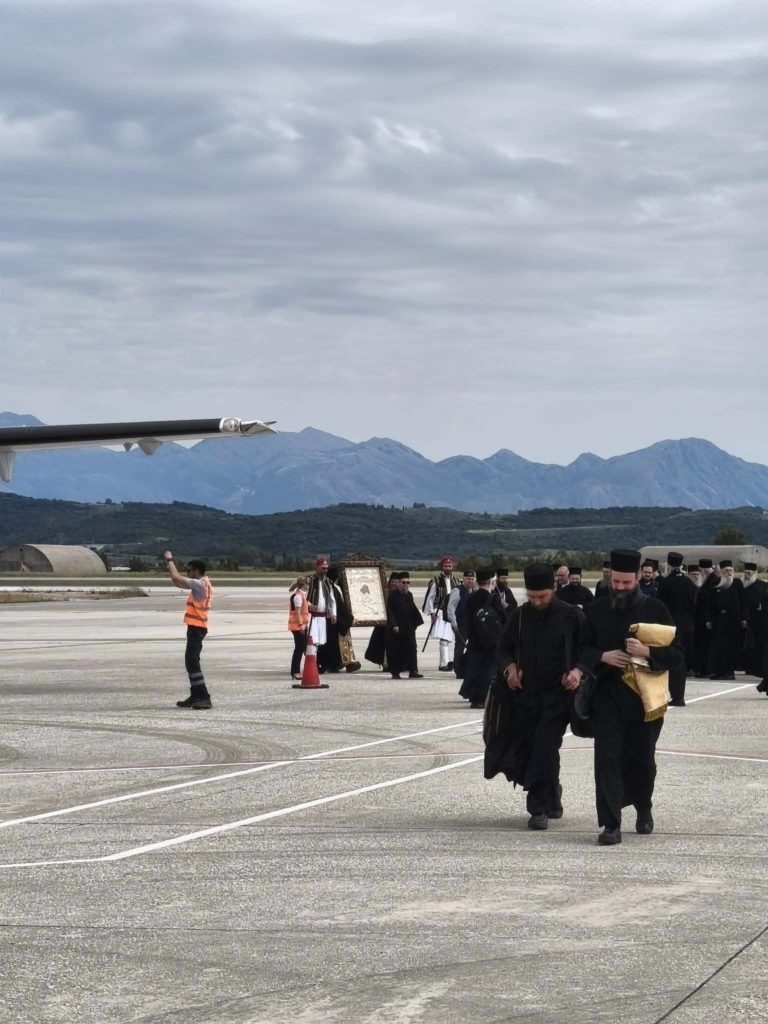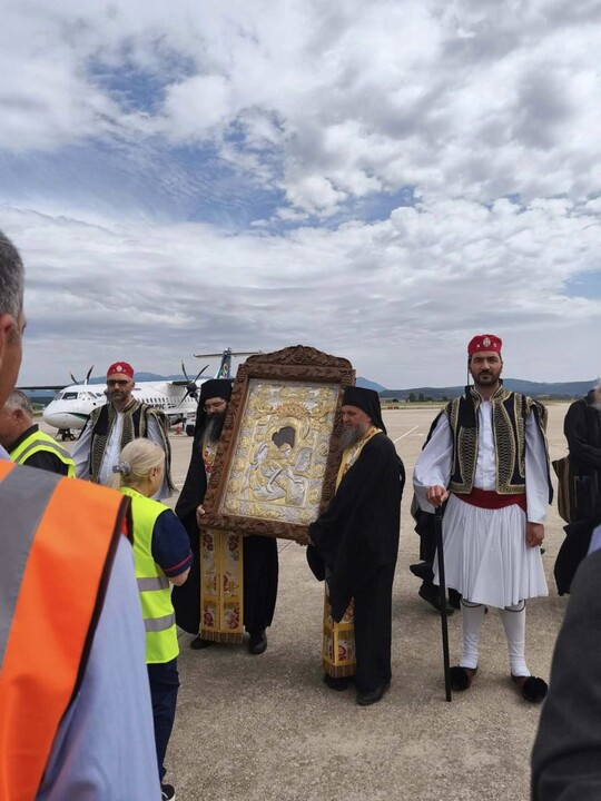 Κατά την άφιξή της στο αεροδρόμιο, την Ιερά Εικόνα υποδέχθηκε ο Αντιδήμαρχος Ακτίου-Βόνιτσας Γιάννης Τσιτουρίδης, ενώ παρόντες ήταν Αγιορείτες Πατέρες που τη συνοδεύουν, κληρικοί της Ιεράς Μητροπόλεως Αιτωλίας και Ακαρνανίας, καθώς και ο Διευθυντής του Αεροδρομίου κ. Νικόλαος Παύλου μαζί με εκπροσώπους της τοπικής αυτοδιοίκησης.